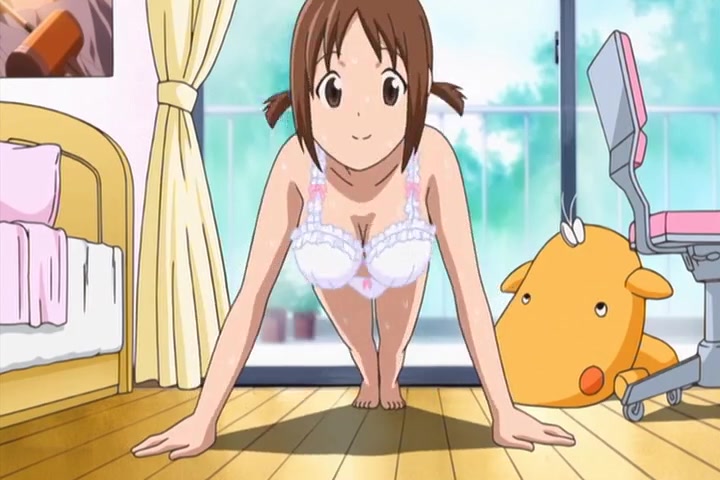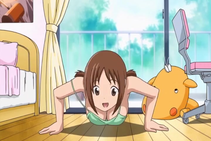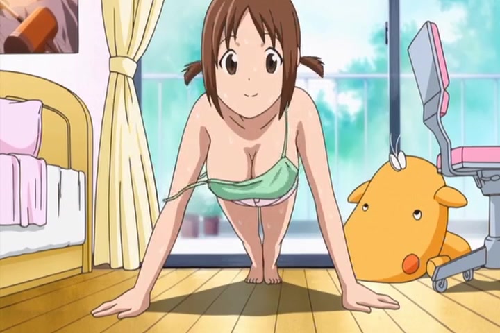 Hinako exercises while bathing, and then begins stretching after getting out of the bath together with Hiyoko.