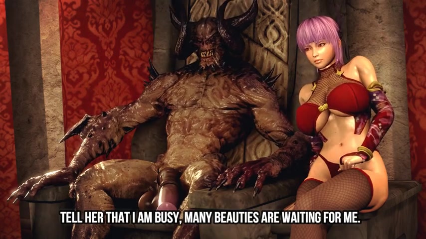 As the demon master sits in his chair, Kasumi offers him a wonderful fuck night, but he has other plans with other beauties. However both bombshells Kasumi and Ayane are going to fuck with bunch of scary monsters. They start side by side - while Ayane's boobs are used for fucking, Kasumi is close to her while someone is fucking her from behind. So they keep fuck with those monsters close to each other and change multiple sex positions. As the lust becomes more and more obvious monsters start to fuck her assholes and together with other guys. At some point of time both girls are fucked by three guys. Then there comes a plenty of cumshots in all possible ways.