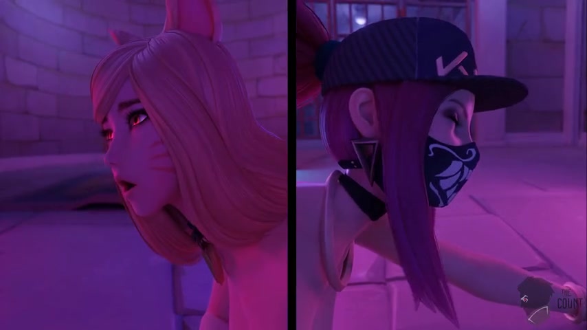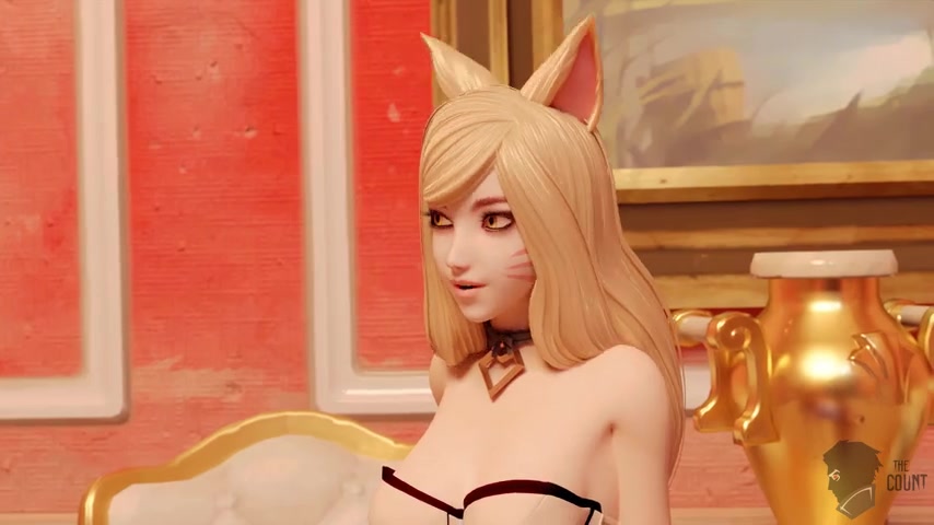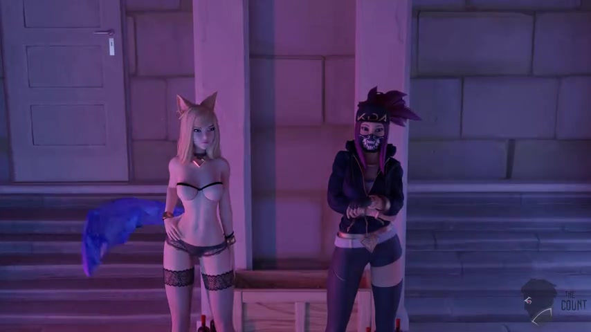 Ahri & Akali wait for an audition to take place, Akali doubts it will be right kind of audition & probably another sex one like last time but Ahri is upbeat it won't be. The butler arrives with his cock sticking out of his pants, he leads them to the basement where it will take place. When the lights turn on they find they are in a room full of naked men so they get to work. Akali removes her top revealing her perfectly shaped breasts. She kneels down & grabs hold of two cocks and begins giving them a handjob. Ahri on the other hand is giving a blowjob to one guy while giving a handjob to another. The man quickly cums, he pushes her head down on his cock so shee gets all of his cum down her throat. Lying down Akali takes a cock in her pussy missionary style as the guy pounds hard & fast into her. Ahri is riding a guy cowgirl style as she gives a guy a handjob. The guy fucking Akali eventually cums filling up her pussy with his hot white sticky stuff. As Ahri continues to give the guy a handjob he shoots cum on her face, she tells him he should of given her a warning as she puts her tail in front of her face blocking the rest of the shots. The guy fucking her pulls her down towards her chest just as another guy penetrates her ass which takes her by surprise. At first she struggles with both her holes being penetrated at the same time but before long she ends up orgasming, all her tails spiking up as she cums. As cum drips out Akali's pussy the guy begins fucking her asshole from behind, she asks him if that's all he's got, he responds by fucking her ass even harder. He eventually cums inside her ass filling it up. Two guys come over to the standing Akali & quickly insert their meaty cocks into her ass & pussy. They fuck away like jackrabbits until they simultaneously cum inside both her holes. The next guy for Ahri takes her sideways on the floor fucking her tight asshole, he thrusts so fast that he quickly ends up cumming. Akali sits atop a guy's cock as it sits inside her ass, she begins riding him cowgirl style. Knowing he's close she straddles him faster & faster until he cums inside her ass. Bent over a barrel Akali gets taken from behind standing up in the pussy by the next guy in line. He goes nice and slow at first before speeding up his trusts. He can barely contain his excitement, he grabs her chest & holds tight as he cums inside her pussy, filling it so much it begins spilling onto the floor. Finally Ahri & Akali side by side get taken by guys prone bone style, they fuck hard & fast progressively fucking faster & faster until they cum inside them. As they lie there exhausted from their "audition" Ahri apologizes for getting it wrong again & says she got a new offer to which Akali tells her to shut up.