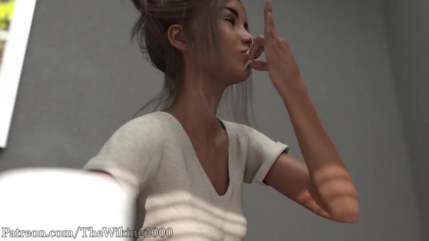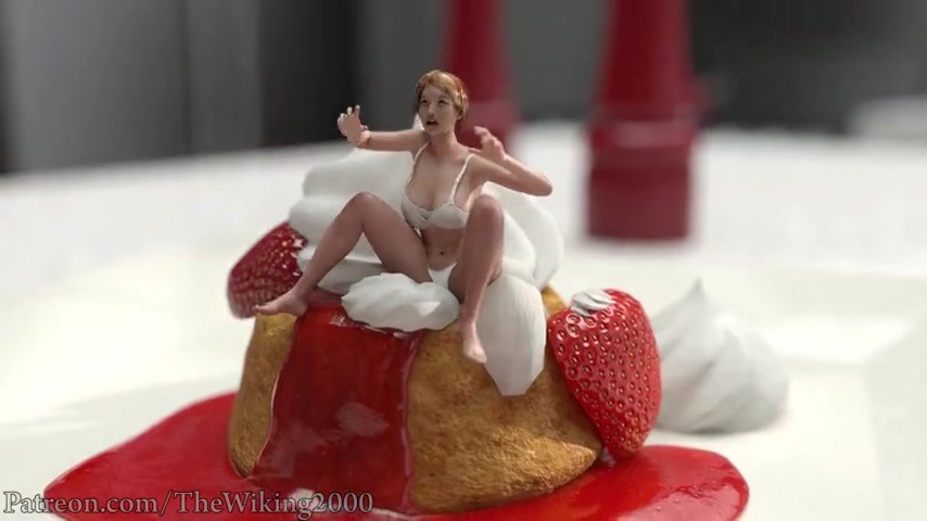 We follow her into the kitchen, where a shrunken woman is seemingly trapped inside a wine glass on the counter. Maxine takes a plate of strawberry shortcake out of the refrigerator and sits down at the counter, narrowing her gaze on the tiny creature. She laughs and picks up the glass as the woman protests for her life and dumps her onto the whip cream atop the dessert. After Maxine eats a couple strawberries, she decides to just have a little taste of the woman. She dips her in the whip cream and sucks it off and licks her all over before taking her entirely into her mouth. She tongues the woman for a second before swallowing her whole.