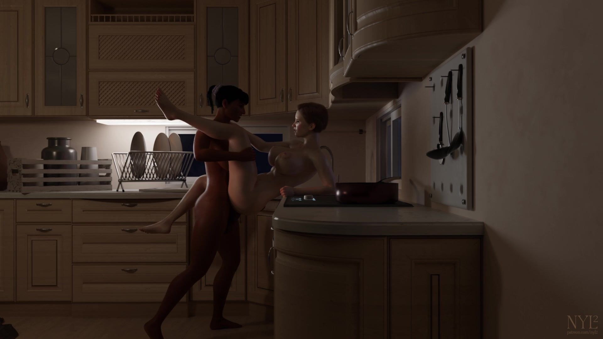 This is a kitchen scene of two busty beauties, one of whom is a futa.