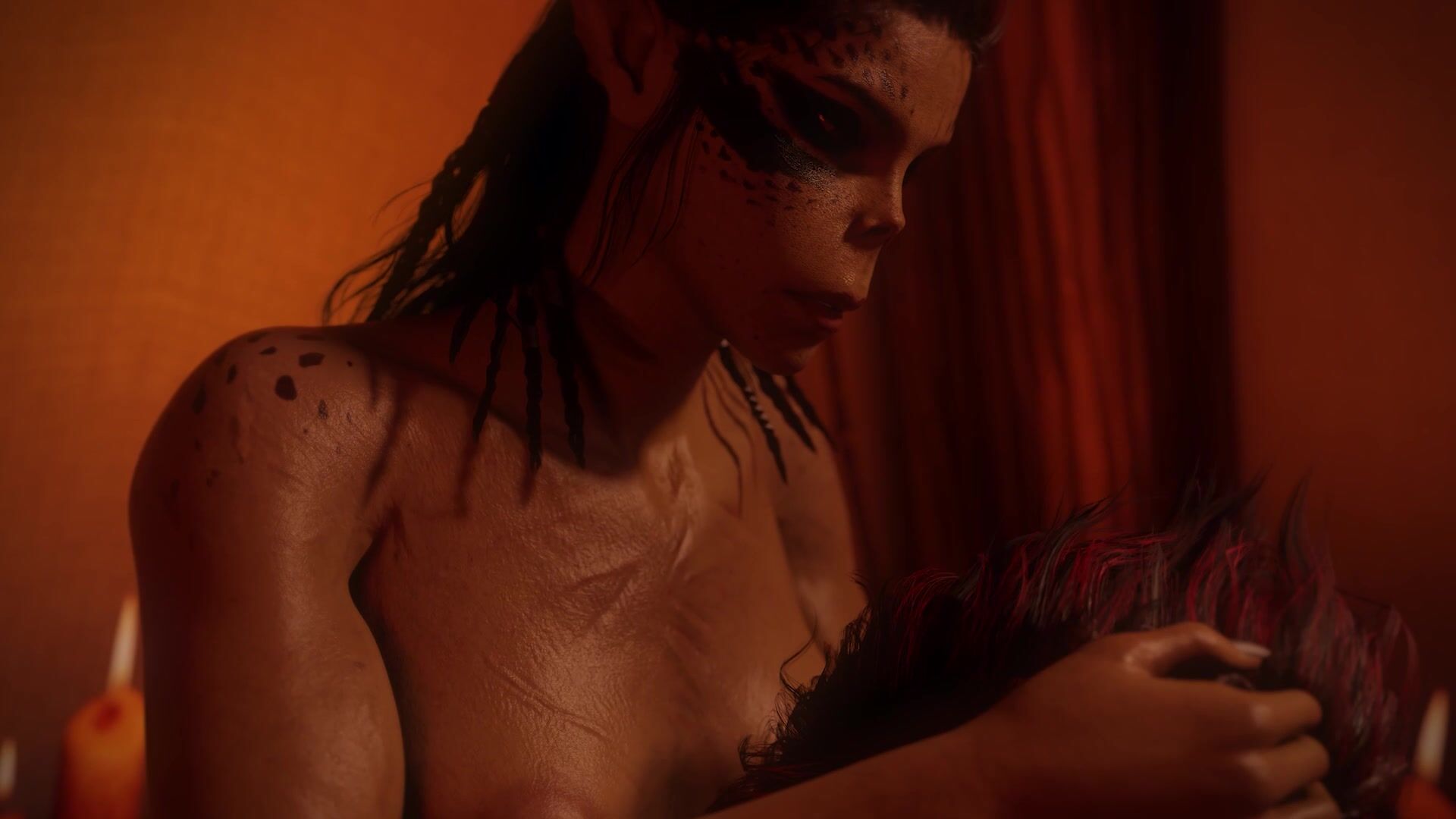 Shadowheart, Lae'zel, & Karlach sleep by the campfire when suddenly Lae'zel wakes up & hears something. She finds a naked man inside the tent. Now naked she licks & sucks his dick. Karlach wakes up & investigates the nosies, Lae'zel pulls her in to join. Karlach gets fucked by the guy missionary.